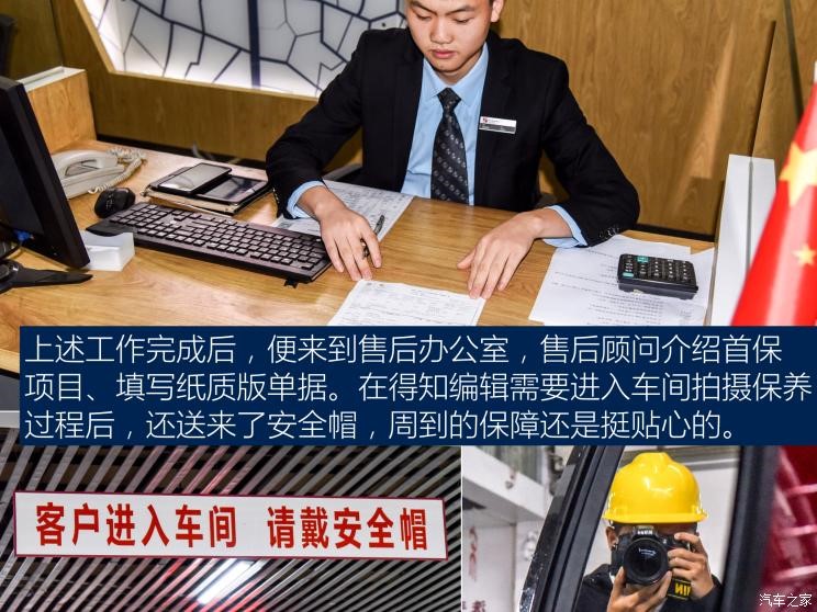 完成相应的登记手续后,售后服务顾问会指引车主去三楼的客户休息室休息。当然,大家也可以选择前往车间观看整个保养、维修过程,且4S店还会为每一位进入车间的顾客提供安全帽,考虑非常周全。