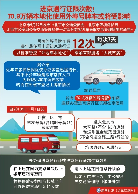 新华社北京6月15日电(记者丁静 鲁畅)北京市15日发布《北京市交通委员会、北京市环境保护局、北京市公安局公安交通管理局关于对部分载客汽车采取交通管理措施的通告》,明确外埠号牌车辆每年最多可申请进京通行证12次,每次7天,以精准管控“外地车本地化”,缓解首都拥堵“大城市病”。