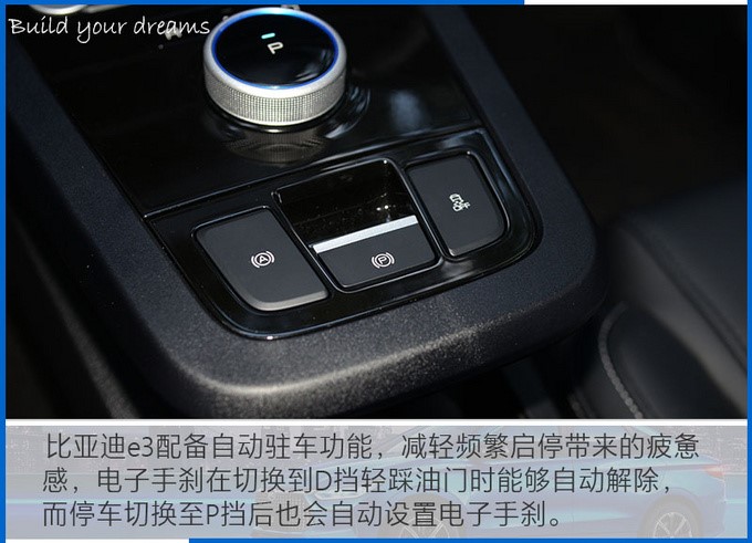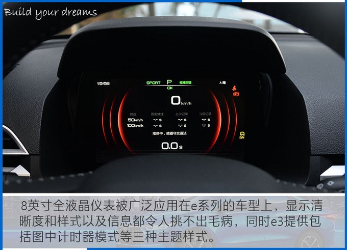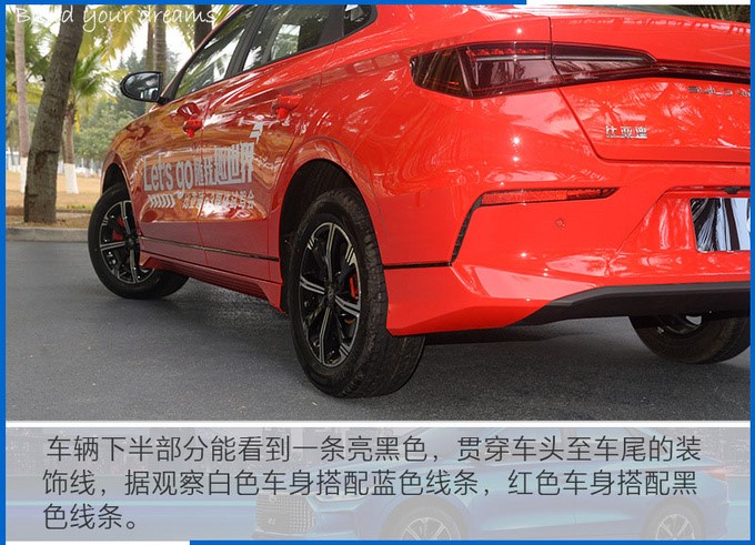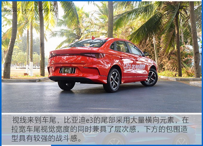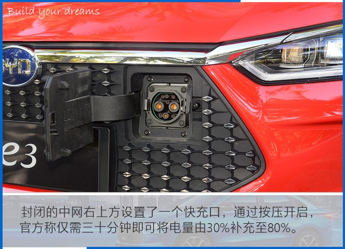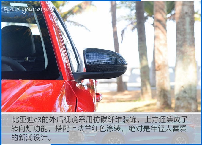 相比较王朝系列大气、耐看的外观来说,比亚迪e3的设计理念更加犀利、年轻化,点阵状进气格栅搭配上运动风格的全车包围省去了后续改装的工序,仿碳纤维的外后视镜外壳和亮红色刹车卡钳非常符合年轻人的审美取向。