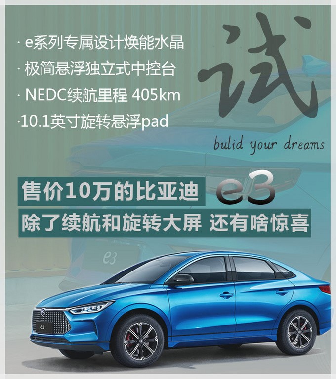 十万元能买到什么轿车?相信这个问题能够激起无数“业内人士”的建议,但是如果在这个大前提下需求是一台续航超过400km,且外观足够犀利、内饰充满科技感的车型呢?恐怕只有本文的主角才能够同时满足这些条件,它就是比亚迪e3。