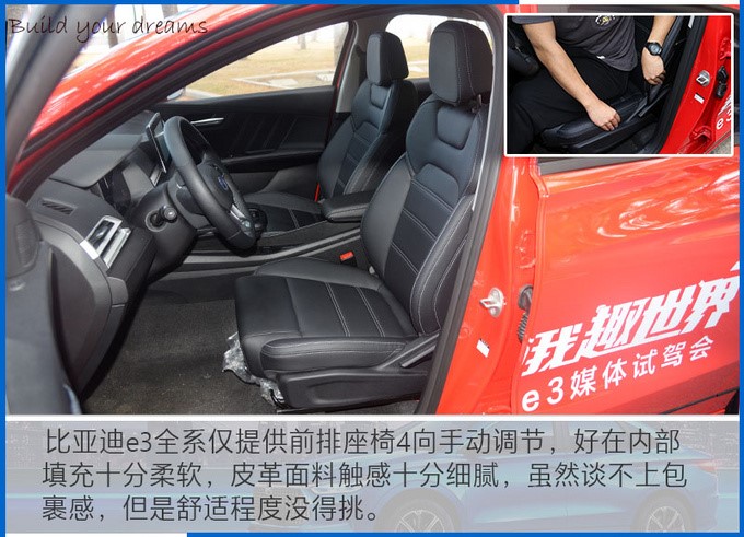 内饰虽然不算比亚迪e3的亮点,但是简洁的中控设计风格搭配上悬浮式屏幕也绝对不显老气,只是在用料上除了手肘门板部位外均为硬塑料材质有些不尽人意,座椅的舒适程度以及空间表现超出了我的预期,总体来说比亚迪e3对于满足日常的代步需求还是完全能够胜任的