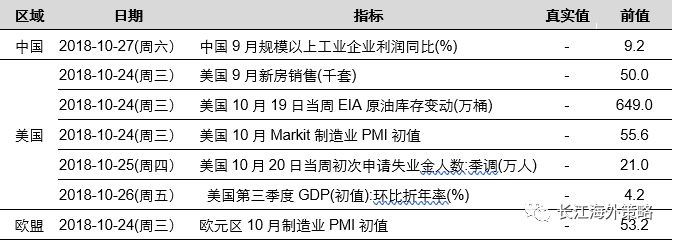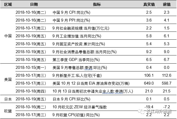 上周美股走势主要受到三季度业绩的影响。一方面,宝洁、美国运通等成分股的三季度财报超市场预期,带动道指和标普500指数单周分别上涨0.41%和0.02%;另一方面,Facebook、推特、英特尔等大型科技股三季报业绩不达市场预期,拖累纳指按周下跌0.64%。此外,美国9月核心CPI同比增长2.2%,不及2.3%的市场预期,投资者对于通胀的担忧暂时缓和。A股市场方面,外部持续受到美股系统性风险拖累;内部公布3季度经济总量数据偏弱,GDP创6.5%新低,一定程度打压了市场情绪;然而,细分数据来看,包括社零、固定资产投资、社融数据均呈现趋势性改善,带动市场信心修复,令周五呈现强势反弹。一周走势总体依然偏弱,上证综指、沪深300指数(3149.824, -38.38, -1.20%)(3149.5132, -38.69,-1.21%)和创业板指数按周分别下跌2.17%、1.13%和1.46%。
