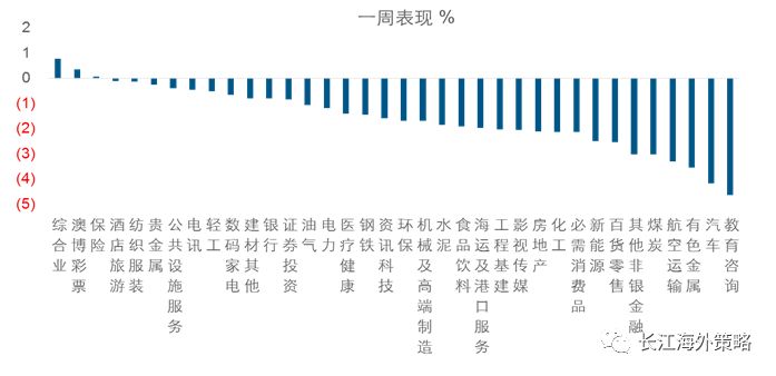 上周恒生沪深港通AH股溢价指数上涨3.17ct至122.94。36类行业中,上周仅3类行业录得上涨,分别是:综合业(0.8%)、澳博彩票(0.4%)和保险(-0.1%)。上周跌幅居前的5位分别是:教育咨询(-4.6%)、汽车(-4.2%)、有色金属(-3.5%)、航空运输(-3.3%)和煤炭(-3%);其中,汽车和航空运输板块的AH溢价幅度环比有较为明显扩大。