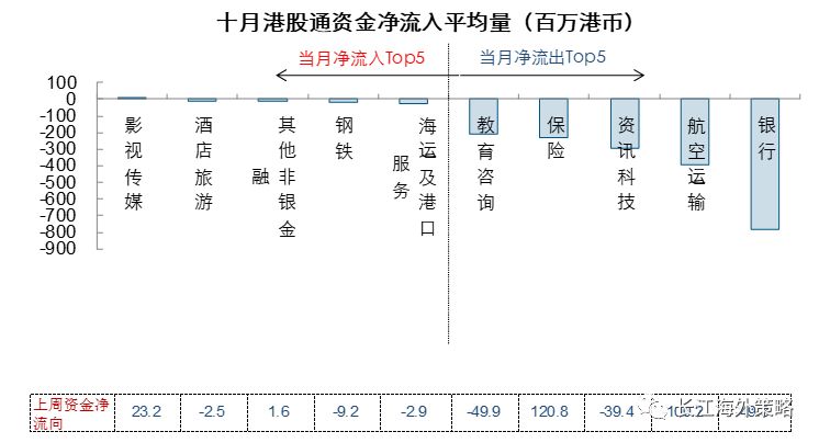 上周恒指收报25,561.4点,累计跌幅0.93%。全球恐慌指数VIX下跌1.42pct至19.89%,恒生波幅指数VHSI按周微跌0.08pct至23.68%;港股主板沽空比例按周上涨2.62pct至16.41,反映港股市场海外风险略有下降,但短期沽压仍旧存在。基于此前报告《再论美股系统性风险,谨慎该国“股债双杀”》的分析结论,美国系统性风险或仅影响港股市场的风险偏好,持续时间不长且影响力度逐步减弱;中长期来看,港股市场仍主要受到国内经济基本面影响。三季度国内GDP增速降至6.5%,料市场悲观预期已伴随疲弱的总量数据“落地”;同时,配合拉动经济“三驾马车”的趋势性改善,以及政府对国内经济支持力度持续“加码”,料四季度国内经济由结构向总量转好将是大概率事件。预计南下资金或加快流入,成为港股反弹的主要驱动力。