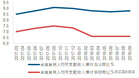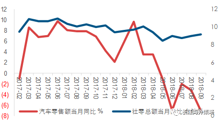汽车总体销量增速放缓,但新能源一枝独秀。2018年以来乘用车销量增速不断下滑,2018年7月到9月连续三个月销量增速同比下降,并在9月份同比下降12%,创下十年来的第二低。乘用车销量的不景气导致汽车零售额同比增速也节节下降,并拖累社会消费品零售总额同比增速放慢。究其原因,一方面,2016年实施的购置税减半至5%征收和2017年按7.5%征收的优惠政策对汽车消费需求有一定的透支。另一方面,今年以来居民可支配收入增长乏力,对汽车消费也产生了一定负面影响。但是从结构上看,虽然乘用车整体销售情况较差,但是新能源汽车一枝独秀。1~9月新能源汽车当月销量保持60%以上增长,累计增速高达93%,为近三年以来最高水平。