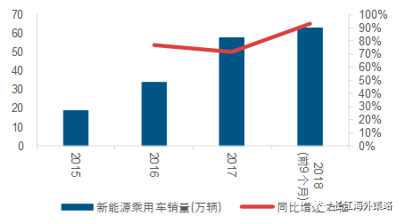 汽车总体销量增速放缓,但新能源一枝独秀。受到购置税优惠政策退出以及今年以来居民可支配收入增长乏力的影响,2018 以来乘用车销量增速不断下滑,但新能源汽车一枝独秀,前九个月累计同比增长93%。