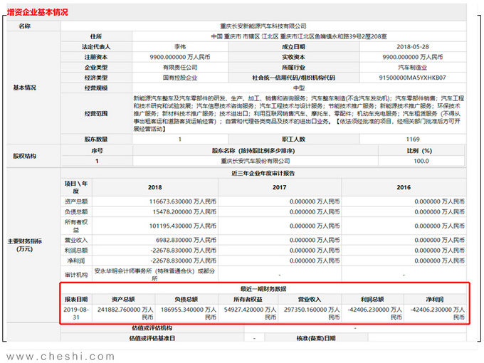 长安新能源在上海联合产权交易所中公布最近一期的财务数据显示,该企业2019年8月31日前负债总额达到18.7亿元,资产总额为24.19亿元。截至2019年8月31日长安新能源利润总额及净利润均为-4.24亿元,需要指出的是,2018年全年净利润还仅仅是-2.27亿元,但到2019年前8个月长安新能源的净利润就已经达到-4.24亿之多(亏损状态)。