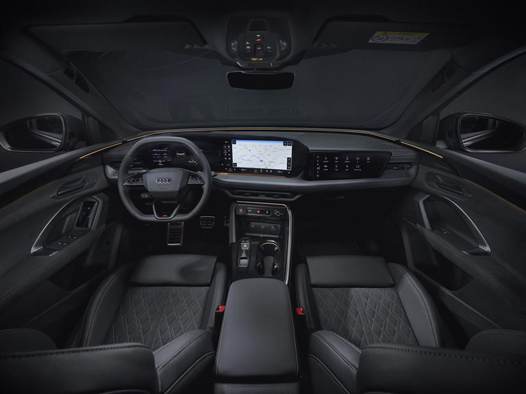 走进车内,新款奥迪 Q5L 的内饰将带来焕然一新的体验。车内采用奥迪最新的家族式座舱设计,科技感与豪华感扑面而来。中控台配备由 11.9 英寸液晶仪表屏与 14.5 英寸中控屏组成的一体式悬浮曲面屏,显示清晰,操作流畅,集成了多媒体娱乐、导航、车辆信息等多种功能。副驾驶位前部还支持设置 10.9 英寸娱乐屏,为副驾乘客提供丰富的娱乐体验。此外,车内还配备了 HUD 抬头显示系统,方便驾驶者查看重要信息。方向盘采用扁平底部设计,融合了双重设计理念,握感舒适,操作便捷。车内大面积采用软性材质包裹,搭配碳纤维饰条点缀,质感十足。车门内层、座椅等部分融入丰富的打格设计元素,营造出更加豪华的氛围。