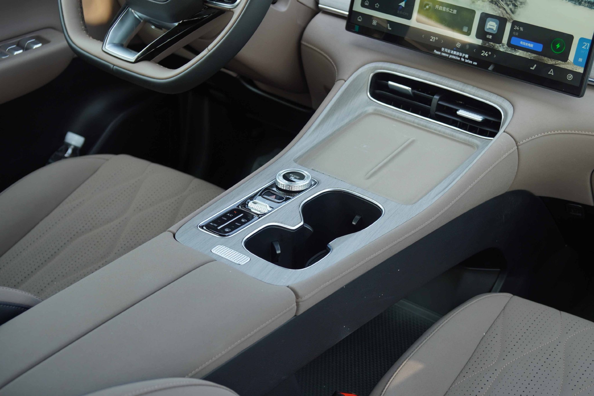 中控通道区域则配备了无线充电面板以及旋钮式功能控制键,整体风格简洁,操作便利。座椅方面,除了前排配有通风加热功能外,副驾驶还配备了女王座椅以及座椅按摩功能。