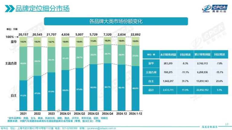 近年来,受新能源车的影响,燃油车的市场份额在不断地下滑,因此,合资品牌的销量也受到了不小的冲击。根据乘联会数据,2024年国内主流合资品牌的市占率只有27.5%,与2021年的45.6%相比,下跌了18个百分点。所以合资品牌如果再不加快插混(包含增程)的布局,与中国品牌的差距只会越来越远。