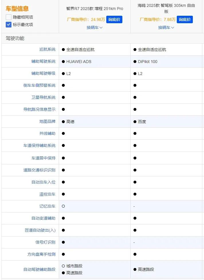 24.98万元的智界R7增程Pro版只比7.88万元的海鸥自由版多了记忆泊车和信号灯识别功能而已。