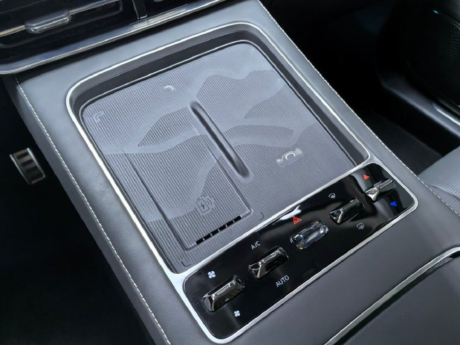 因为采用了怀挡的换挡方式,所以中央通道的空间得到了最大程度的释放,不仅采用了双层的布局,同时上层位置也是设计了手机无线充电面板,并且在面板的后方位置还保留了车内为数不多的实体按键,这里可以对空调进行快捷操作,包括温度、风量、除雾等,实用性确实很高。
