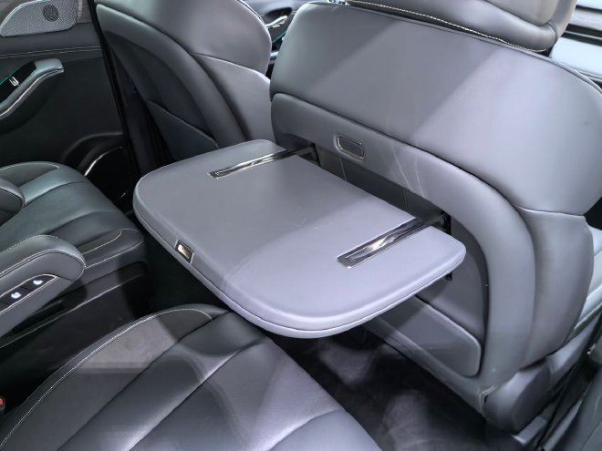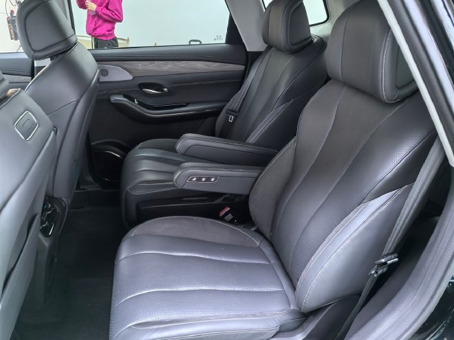 在二排座椅的扶手内侧是设计了三个单独的开关,这里可以快捷开启座椅的加热、通风和按摩,并都带有三档调节,这个设计也是我个人比较喜欢的。在这里也是要着重说一下,一二排座椅都是10点按摩,并且靠背和座垫都是带有加热和通风的,右侧还配备了小桌板,真是很贴心的配置。