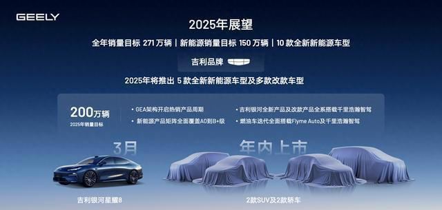 昨天吉利汽车以2400亿元营收交出一份高分答卷,进入2025年,这家国产车企的步子迈得更大了——全年销量目标271万辆,新能源车占比超过一半。对于普通消费者来说,明年买车可能会遇到哪些新选择?用车体验会有哪些升级?我们从产品、技术到服务,帮你梳理清楚。