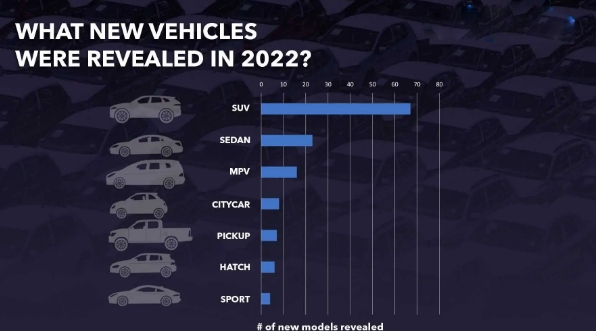 正如预期的那样,SUV 继续引领潮流。它们占2022 年发布的新乘用车总数的51%。上汽、吉利、本田和 Stellantis 是领先该排名的制造商。