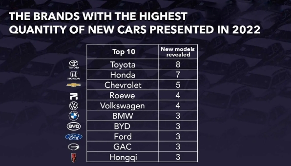 丰田是全年展示更多新车的汽车制造商。根据我的研究,这家日本 OEM 展示了11 款不同的车型,包括 4 款 SUV、3 款轿车、3 款 MPV 和一款城市轿车。这与丰田(包括丰田品牌、雷克萨斯和大发)在 2021 年发布的新车数量相同。