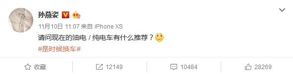 双十一期间,新加坡歌手孙燕姿突然发布一条微博,称“是时候换车了”,并且,她特别强调了自己将选择“油电/纯电动”产品: