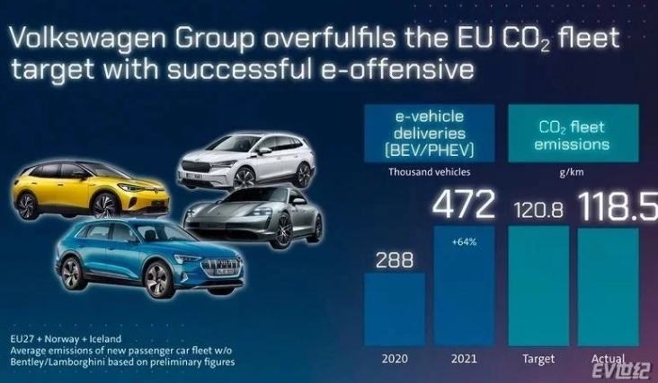 电动汽车销量增加大众集团完成欧盟2021年的二氧化碳排放目标