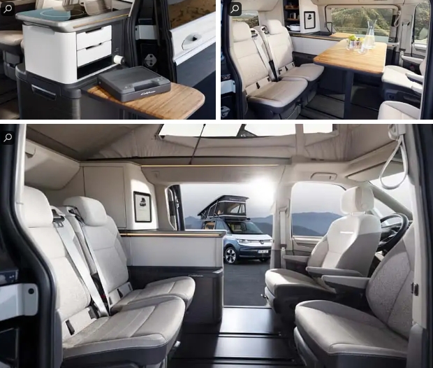 通过增加第二个滑动门,大众将新款 California 称为三区概念车。第一区位于右侧,乘客可以像乘坐货车一样进出一周执行日常任务。周末,这个区域变成了一个开放式帐篷,有一个单柱遮阳篷向外延伸,为门口遮荫。第三区是货车的另一侧,现在可以通过新的滑动门进入,并用两柱遮阳篷遮蔽,用于烹饪和用餐。