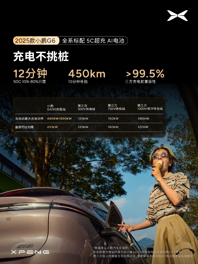在续航与充电方面,2025款小鹏G6基于全域800V高压平台打造,标配5C电池,可实现充电10分钟续航450km的惊人表现。此外,G6还提供了625km和725km两种CLTC续航里程,满足不同消费者的出行需求。智驾方面,G6全系标配小鹏图灵AI智驾,无需单独选装和订阅,即可享受从车位到车位的高阶智驾体验。
