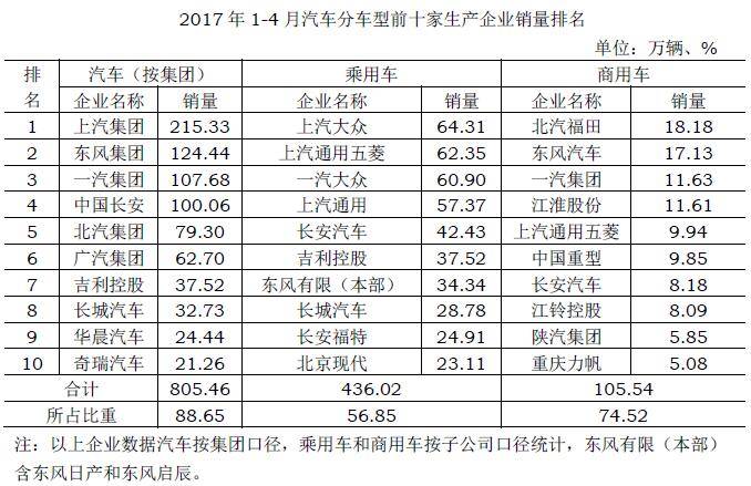 2017年1-4月汽车分车型前十家生产企业销量排名