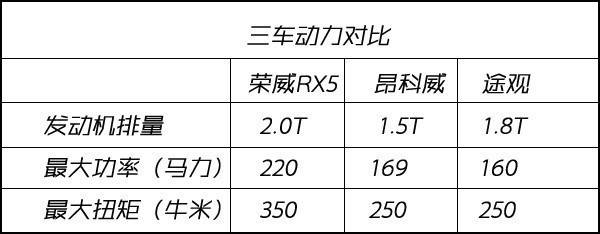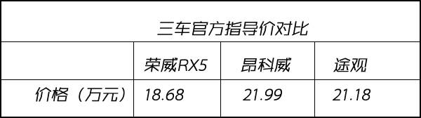 我们选择价格相近的车型参与本次的对比。分别为荣威RX5 30T四驱互联网智尊版(下文简称荣威RX5),18.68万元;昂科威2016款20T两驱领先型(下文简称昂科威),21.99万元;途观2016款300TSI自动两驱风尚版(下文简称途观),21.18万元。