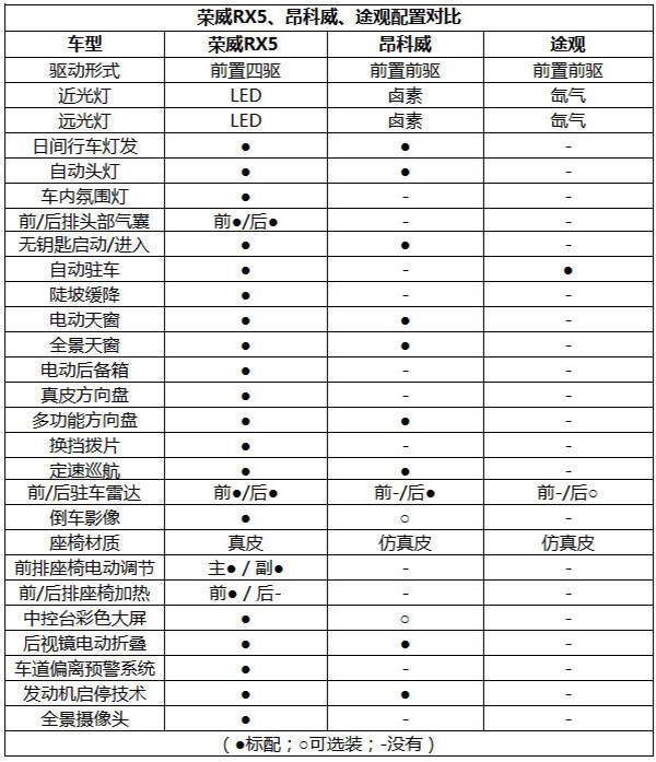 从上表中可以看到, 价位相近的三款车中,荣威RX5配置是最丰富的。电动尾门、一键启动、无钥匙进入、GPS定位、自动驻车、陡坡缓降等配置,在荣威RX5身上都能找到。但是昂科威和途观就不那么尽如人意了,昂科威还保留天窗,无匙进入,定速巡航等配置,而途观基本是没有这些配置,性价比最低。荣威RX5还配备了同级最大的全景天窗和10.4英寸高清触控电容屏。