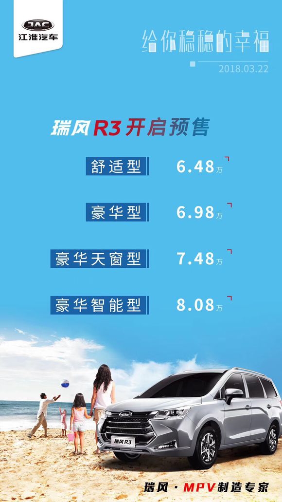 江淮汽车宣布启动旗下首款家用MPV瑞风R3的预售
