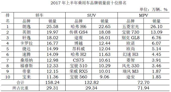 2017年上半年乘用车品牌销量前十位排名