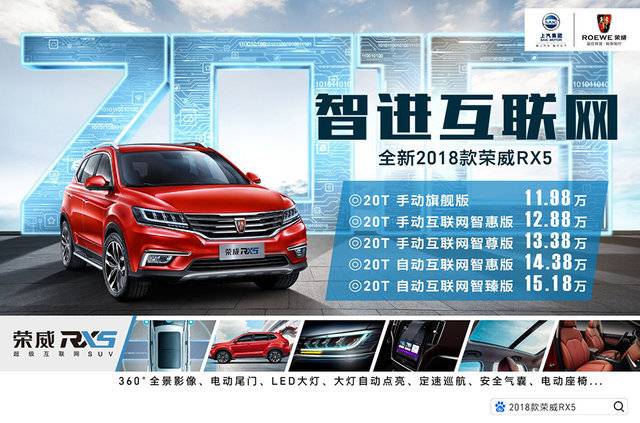 2017年10月16日,2018款荣威RX5正式上市,售价区间为9.98-18.68万元。2018款荣威RX5新增了20T 手动互联网智尊版、20T 自动互联网智惠版、20T 自动互联网智臻版三款车型,同时20T 手动旗舰版和20T 手动互联网智惠版两款车型增配不加价。