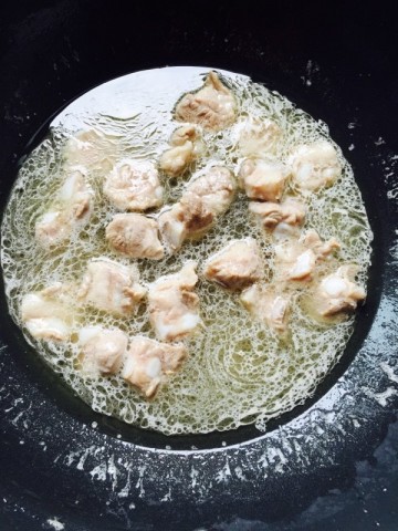 5. 适量油下锅,倒入脆骨放入姜丝,大蒜子颗粒,干辣椒,加入适量酱油,翻炒均匀。