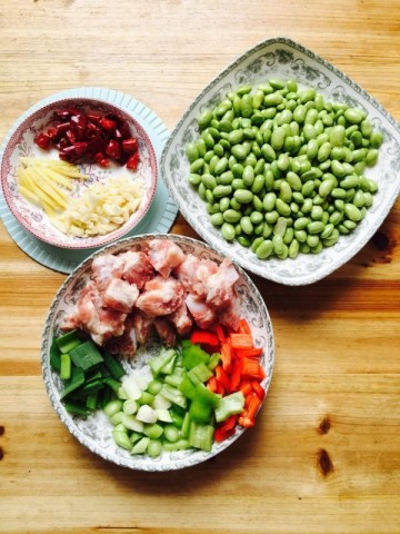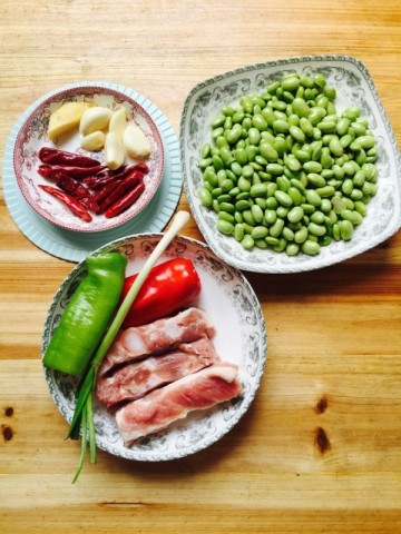 1. 准备好青豆、脆骨、红椒、青椒、青蒜、大蒜子、干辣椒、姜、洗净备用。