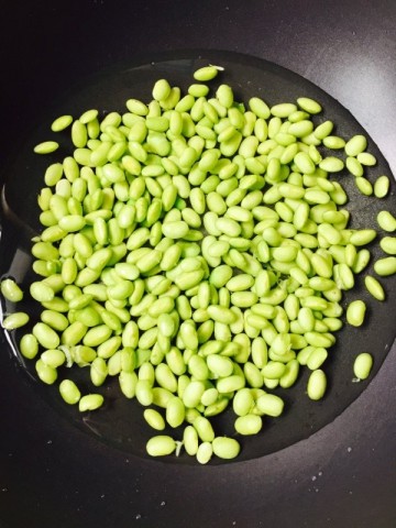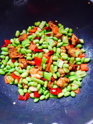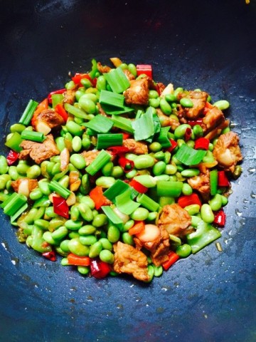 6. 脆骨完全上色酱油后,倒入青豆,红椒、青椒,继续大火翻炒。