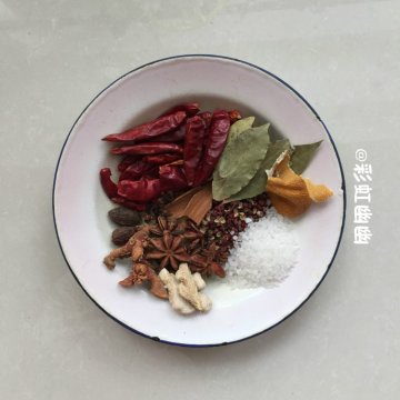 3. 准备好卤料:生姜、良姜、八角、花椒、草果、香叶、桂皮、陈皮、大粒盐、朝天椒、冰糖;