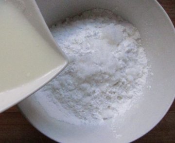 3. 加入适量牛奶,慢慢搅拌成面絮状。