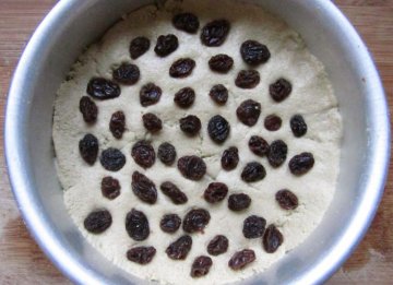 6. 最后再铺上小米上面放点葡萄干。可以在表层淋少许的水,利于蒸熟。