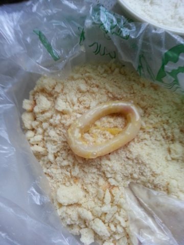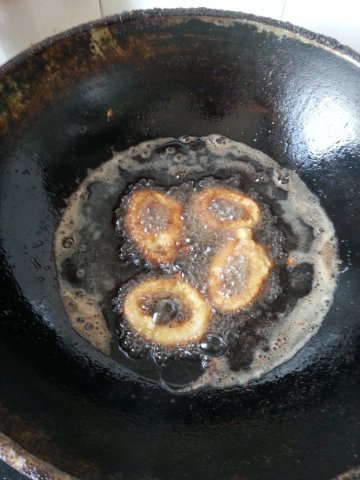 6. 锅内倒入油,烧至六七成热时下入鱿鱼圈,炸至金黄即可。