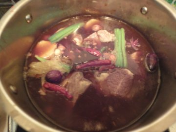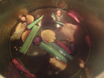 2. 老卤汤(如没有老卤汤可用市售卤汁加水代替)里加入卤料包(有纱布的话可以将卤料用纱布包扎好放入)。