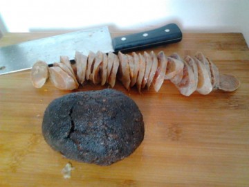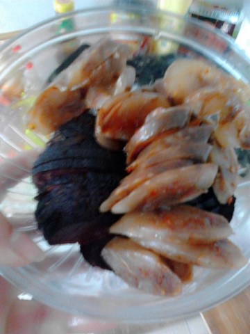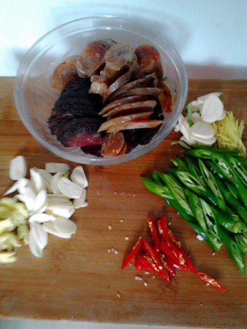 1. 首先血粑放入热水中煮一煮,这样方便切,冷的时候很硬的,煮软后好切一点,香肠用热水洗净切片