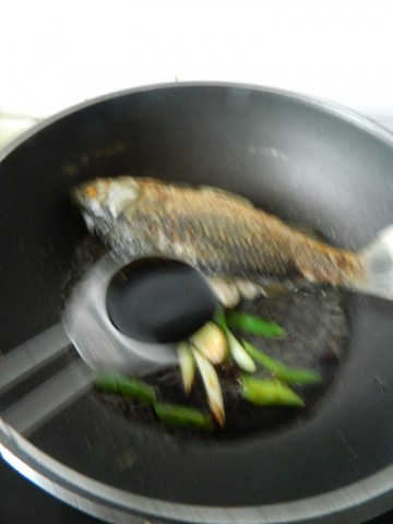7. 炒锅倒油烧热爆香葱姜,放入鲫鱼。