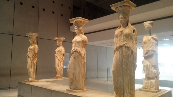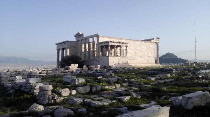 进入山门后,视野豁然开朗,各神庙稀疏地分布在碎石堆之间,远处是雅典的群山和天幕,给人一种遗世独立的感觉。离山门最近的神庙是厄瑞克赛翁神庙(Erechtheion),它以外部的六座少女立柱而知名。不过走近看会发现,这些少女们似乎显得过于“年轻”,与身后风蚀严重的神庙画风迥异。原来,这些立柱都是复制品,它们的真身有五座藏于2009年竣工的卫城博物馆,剩余一座藏于大英博物馆。
