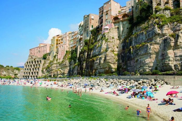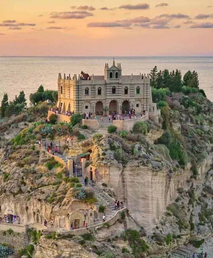 特罗佩阿坐落在清澈见底的海水边高60米的巨石群上。开满鲜花的广场上点缀着巨大的阳伞,周围是常见的三层小楼,商店门口挂着编成辫子状的辣椒和洋葱。这里的建筑略有些破败的气息,但却刚刚好营造出一种浪漫的感觉,这正是典型的意大利小镇。