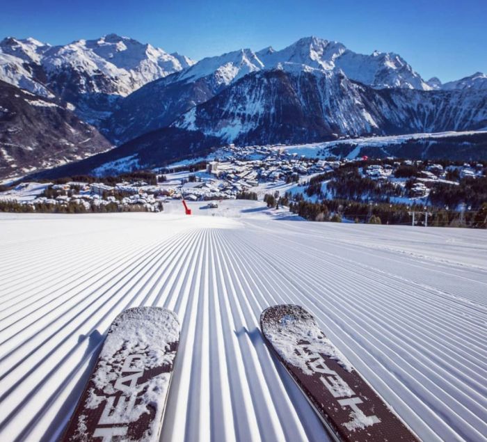 热身之后,当然是去旁边的贝勒科特(Bellecôte Piste)滑雪场滑雪啦。住在顶级酒店的一大好处就是,连租装备这种事情也有人帮你跑腿。每天早上你的雪鞋手套一定被烘干到暖和,雪具也会在直通雪道的门口按房间号整齐排列好了。
