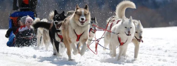 滑雪发烧友可以体验从雪道上飞驰而下的快感,而不会滑雪的同伴,则可以尝试狗拉雪橇,来感受贴地飞行的刺激。披着毛毯坐上雪橇,就看看由哈士奇+阿拉斯加+萨摩耶组成的雪橇队穿越茫茫雪地,会把你带去哪儿吧!