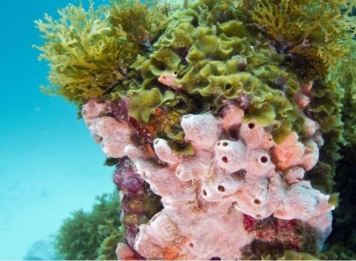 刚入海不久,雕塑上便长出了少量的海藻,渐渐地,周边积聚的海洋生物越来越多,过上一段时间再看,已经有珊瑚在雕塑上安家,还有鱼群过来觅食。