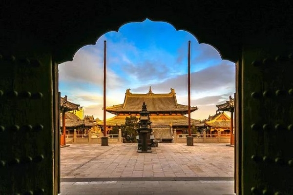 华严寺始建于辽,依据《华严经》而命名,当时为辽国皇室宗庙,地位显赫。从大雄宝殿的大门向外看,夕阳中的云朵为背景,佛国世界层次分明,一派庄严、静谧、祥瑞。