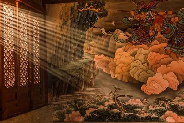 永乐宫大型壁画题材丰富,画技高超,共近1000平方米,不仅是我国绘画史上的重要杰作,在世界上也是罕见巨制。夕阳照射到壁画上,似驾着光在山间游走。