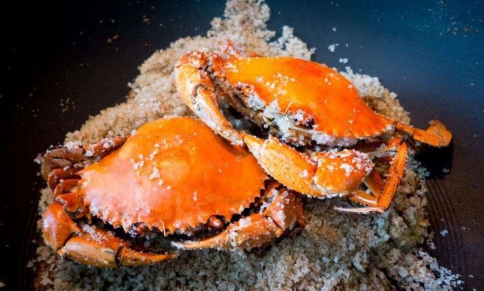 到顺德的第一个晚上,吃到南记海鲜饭店的第一口盐焗奄仔蟹,就惊为天人——也许应该说“天蟹”:一个大砂锅盖着红艳艳油光光两只奄仔蟹,薄纸下面铺了满满一层滚烫的粗盐,忍着烫手剥开蟹壳,一股浓郁鲜香扑面而来,蟹黄饱满得渗透了蟹壳边边角角,蟹脚细嫩清甜,蟹钳饱满鲜甜,极简的盐焗做法将所有滋味紧紧封在蟹壳中,点滴不流失。