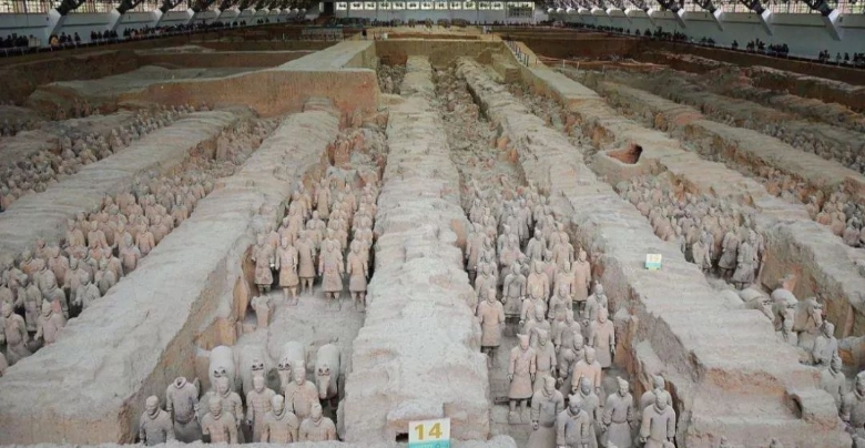 秦兵马俑:被称为世界第八大奇迹,位于陕西西安市秦始皇陵东面约1.5公里的兵马俑坑内。最早发现的是一号俑坑,呈长方形,坑里有8000多个兵马俑;一号俑坑左右两侧各有一个兵马俑坑,称二号坑和三号坑,先后有两百多位外国元首和政府首脑参观访问。