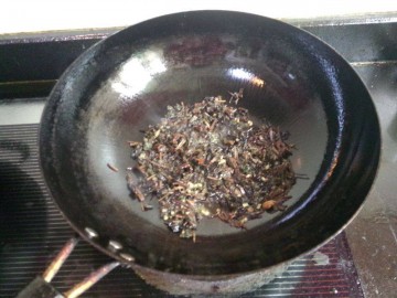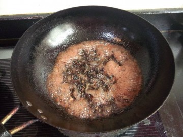 10. 锅里油热,放入姜末,煸炒出香味,放入梅干菜煸炒一下,